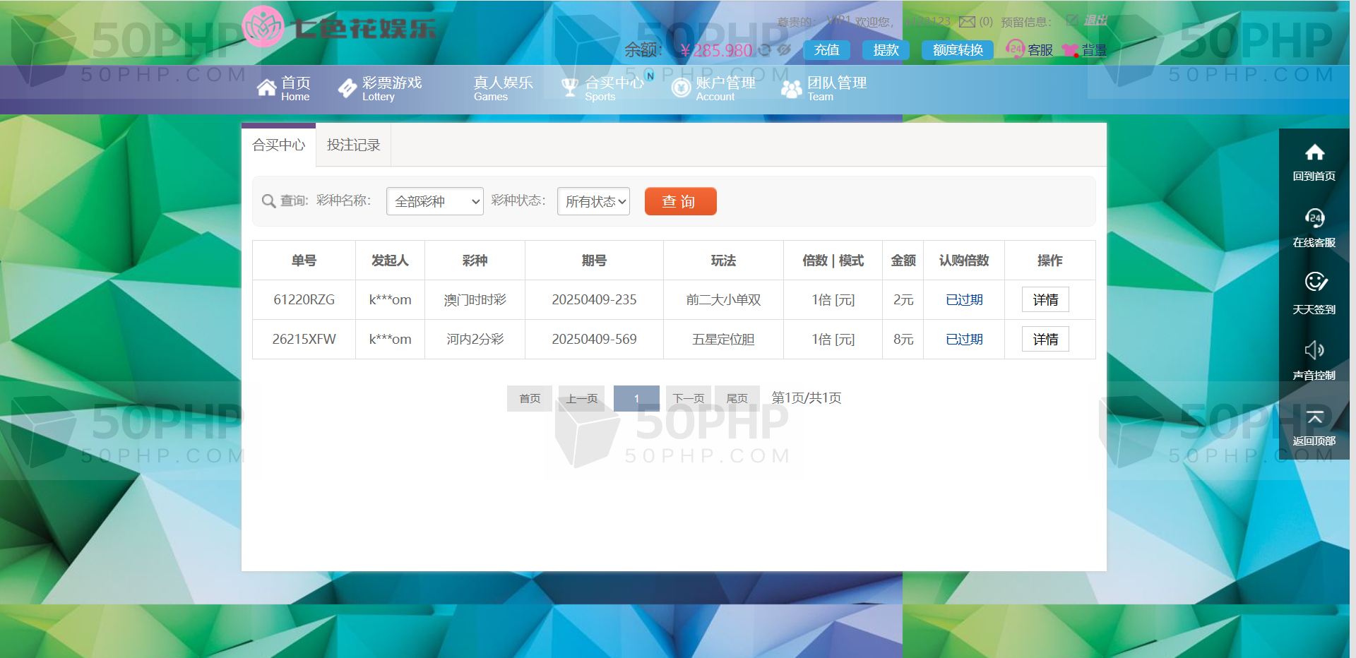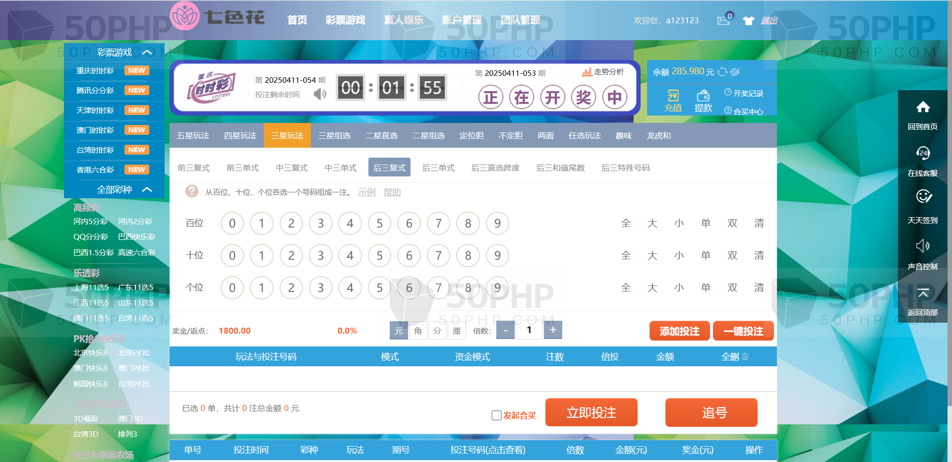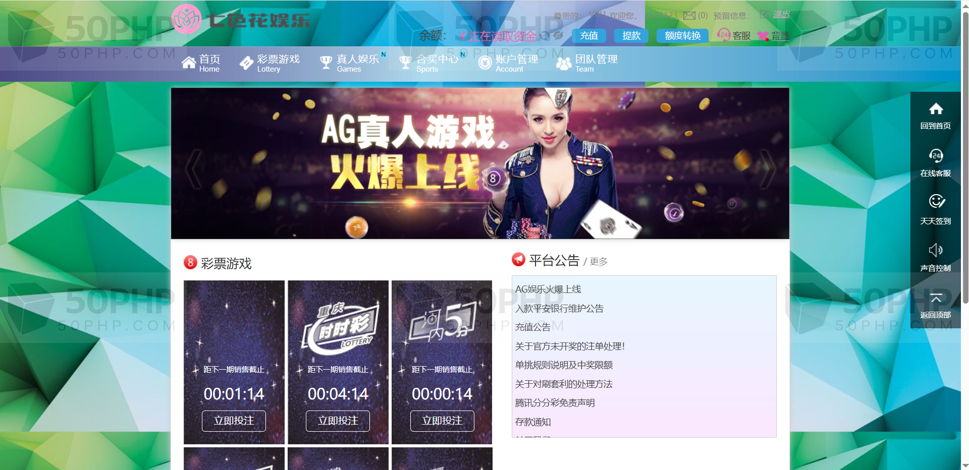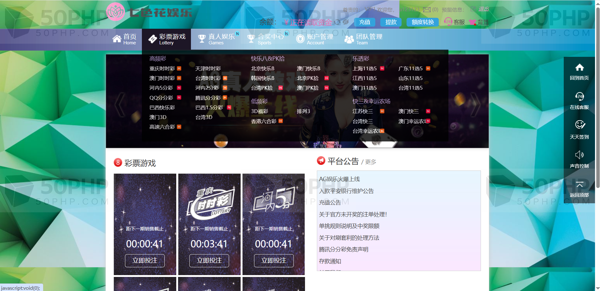 杏彩系统七色花ssc平台,天恒框架,PHP语言开发,杏彩改版带WAP手机版,元/角/分/厘模式,带真人接口。