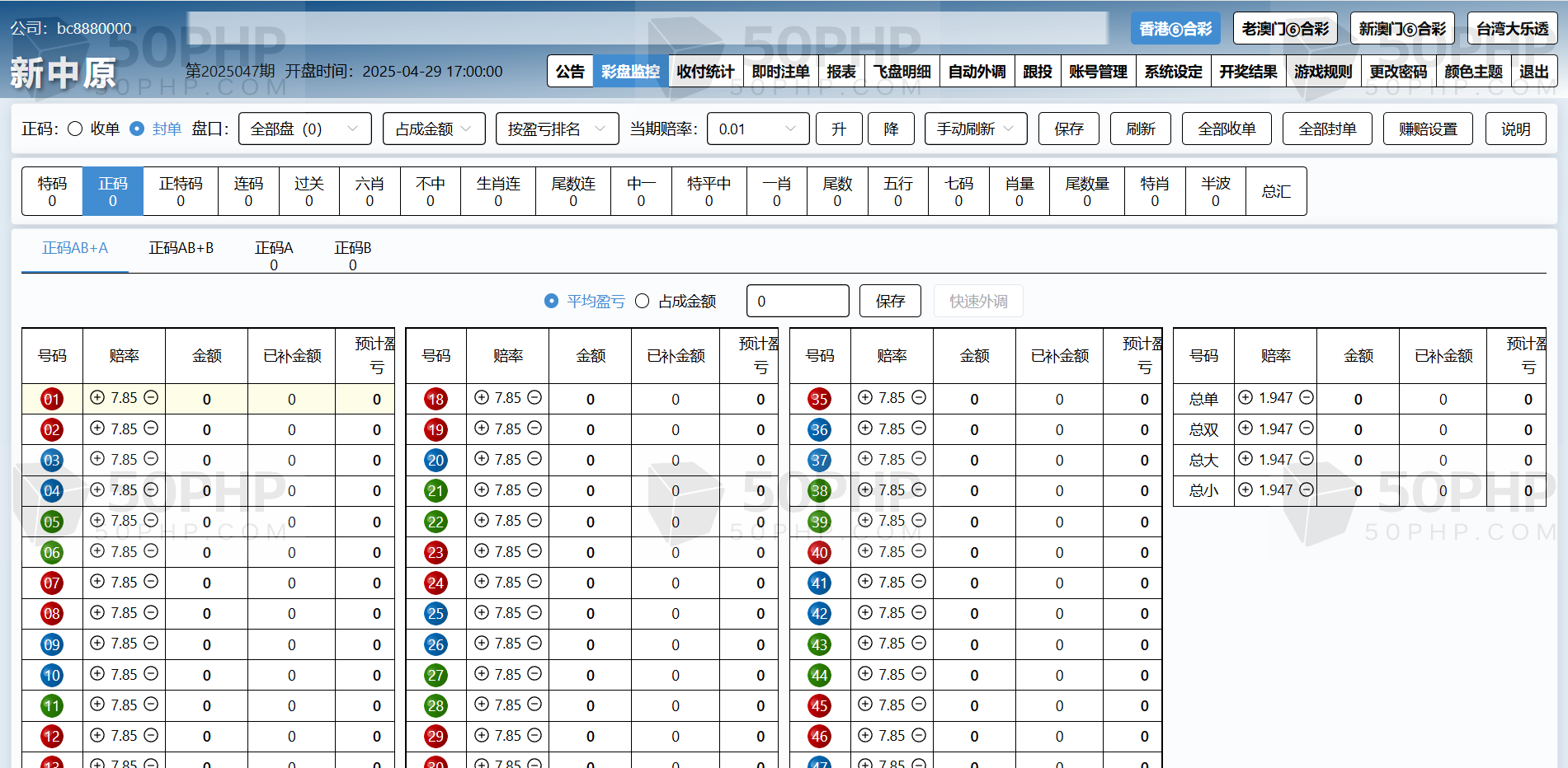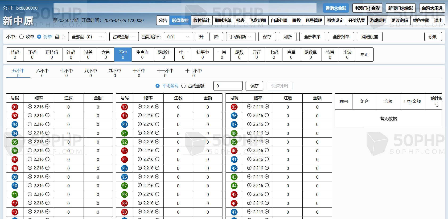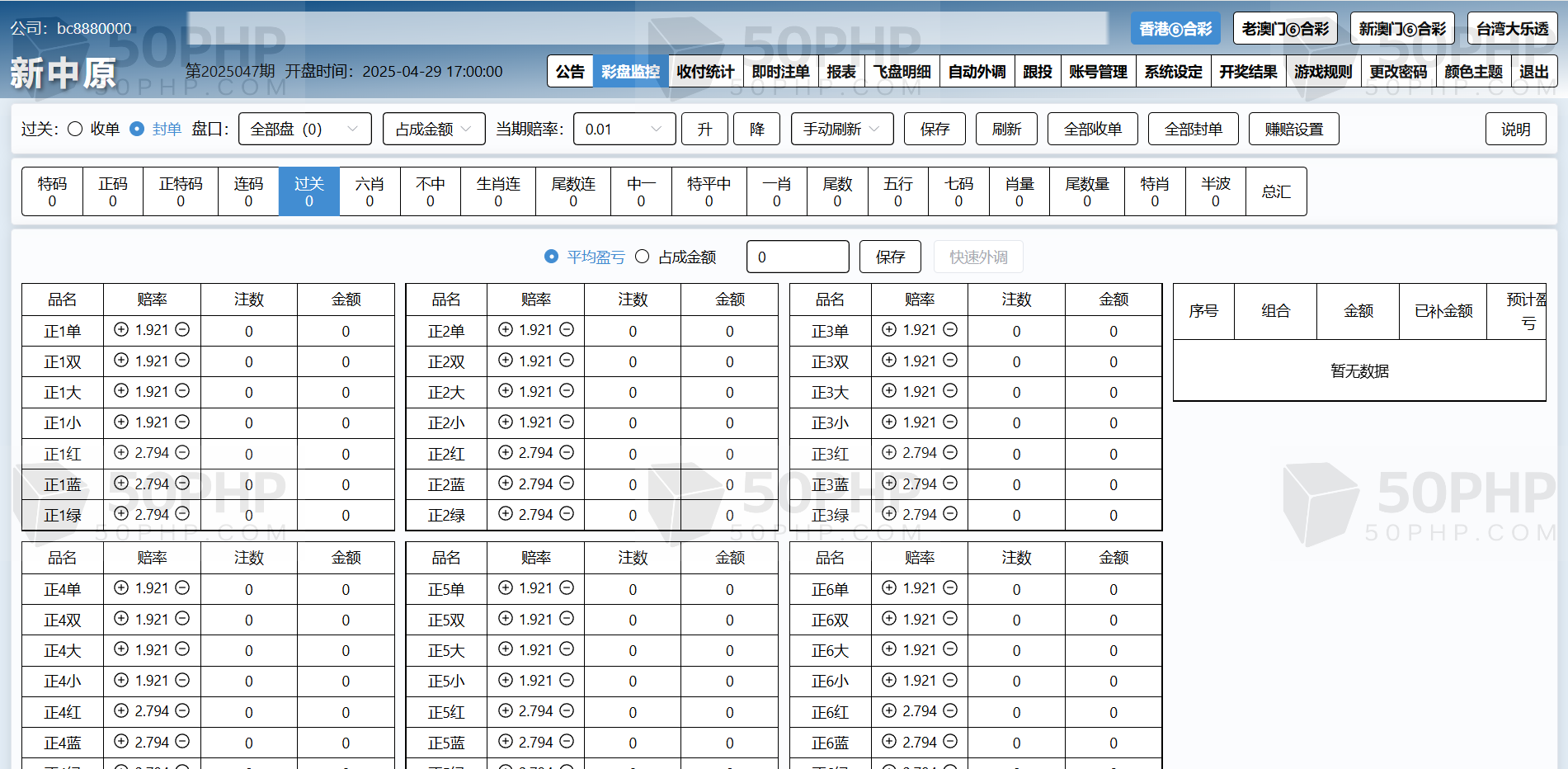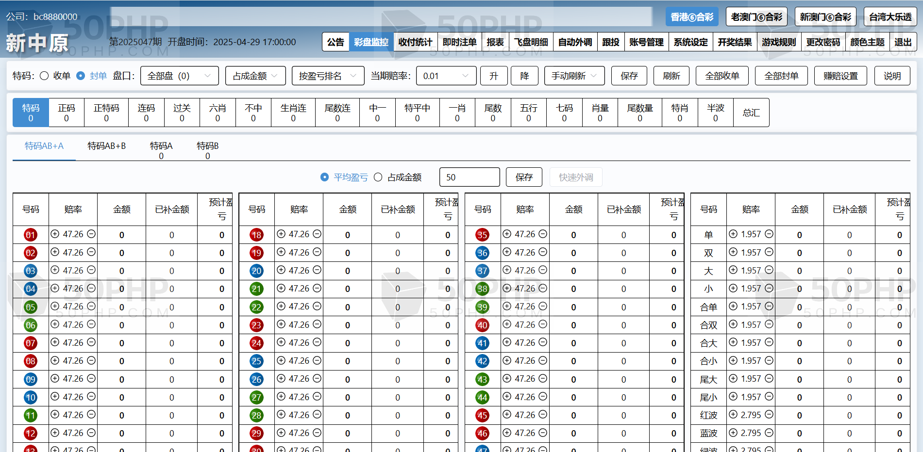 特色①后台可单独开启或关闭任意一个代理及会员的彩种。任意更改公司名称及安全码。可单独设置任意一个代理的赚赔率功能,可设置自动外调(自动生成外调注单)