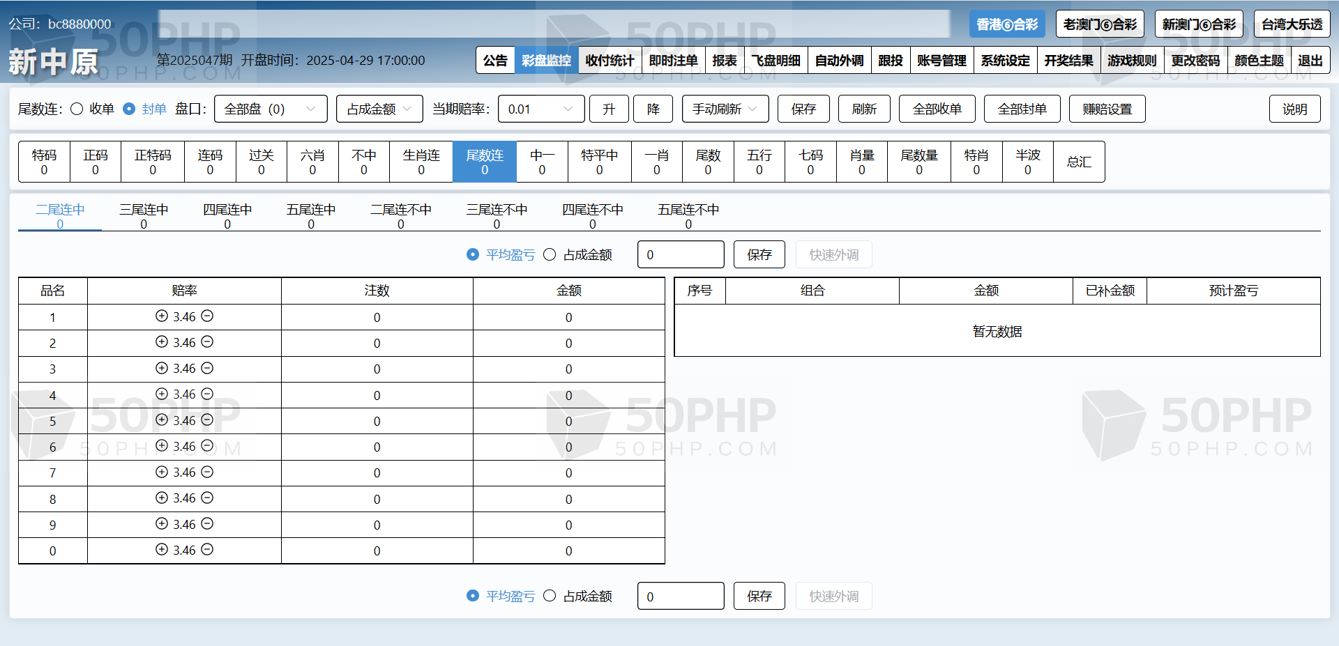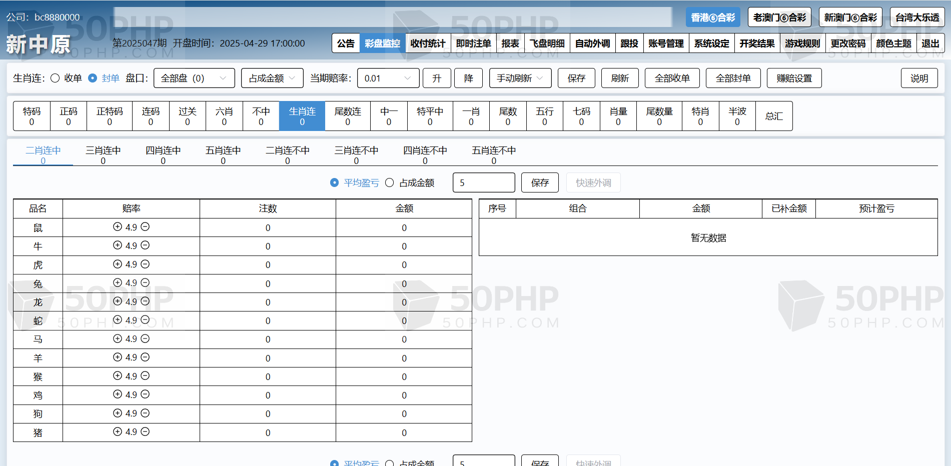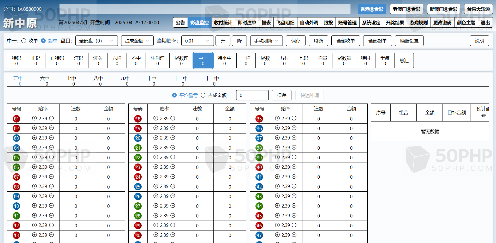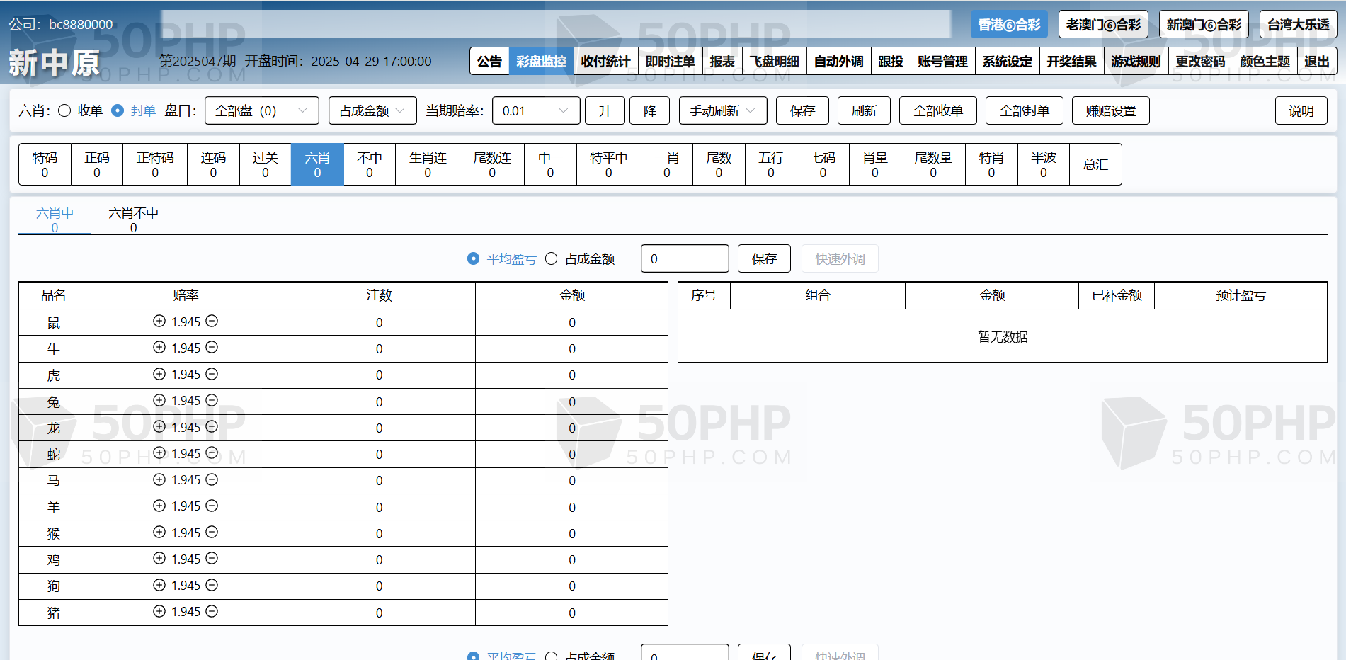 特色①后台可单独开启或关闭任意一个代理及会员的彩种。任意更改公司名称及安全码。可单独设置任意一个代理的赚赔率功能,可设置自动外调(自动生成外调注单)